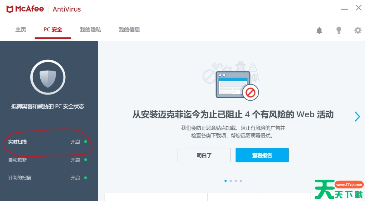 1、打开mcafee软件,点击“PC安全”,接着点击页面左侧的“实时扫描”。