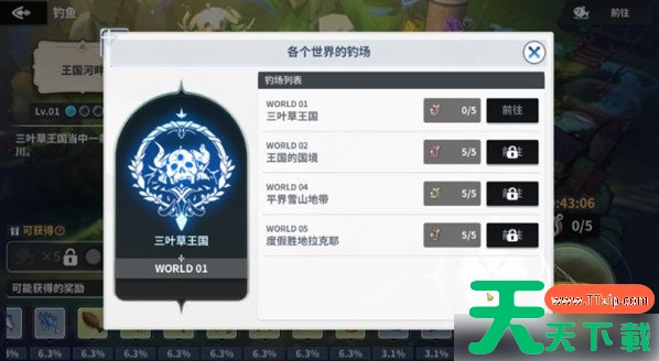5、在一处钓场用完「钓饵」后,「钓饵」会自动恢复数量,这时候你们可以在「各个世界的钓场」弹窗中选择想要继续去钓鱼的场所!