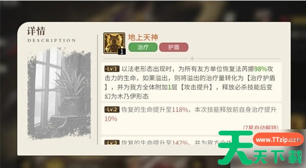 另一技能神之化身可根据法芮娜在队伍中的站位,来切换她以什么样的形态进站作战。位于前中排时,法芮娜会以法老形态登场,为队友提供太阳威光增益,来提升队伍的整体输出。而当法芮娜处于后排时,她会以木乃伊形态登场,对敌方全体施加冥河诅咒,降低全部敌人的输出,且该诅咒无法被驱散。此外,当法芮娜以法老形态出战时,她还通过地上天神技能为队友提供不错的治疗能力,若治疗所加的血量超过目标最大血量上限,本次溢出的治疗量还可被她转换为护盾保护目标,该效果为实时生效。