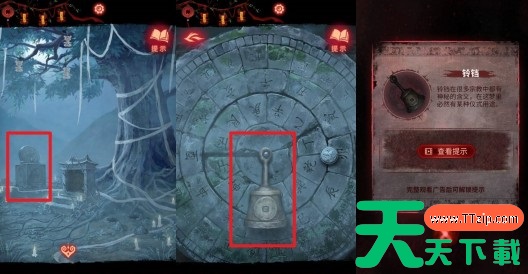 【聂莫黎视角】进入树根区域的塔内,点击画面中间的大钟,在道具栏选择【铃铛】放在没有铃铛的铁链上,获得铃铛图案线索。