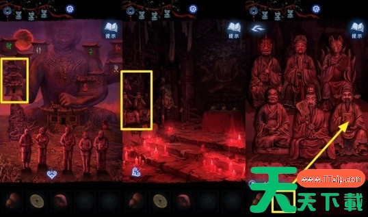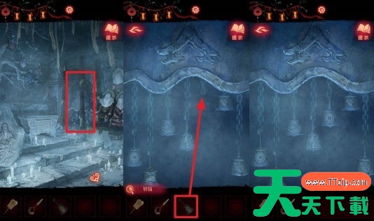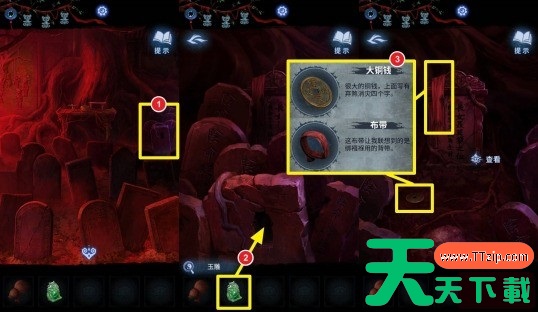 【聂莫琪视角】解开墓碑贡品谜题后,庙内红雾散去,点击画面右侧有空洞的墓碑,在道具栏选择【玉雕】(解开纸娃娃面具谜题获得)放入空洞,拾取【大铜钱】和【布带】。