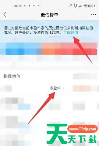 打开手机上的天天基金app,点击【指数宝】。 在指数宝中点击左上角的【低估榜单】。 在低估榜单中可以看到市盈率,点击上方的【了解详情】。 在详情页可以看到指数基金市盈率计算方法,等权市盈率则是不同的基金通过加权平均求得。 @天天下载TTzip 除特别注明外,本站所有文章均为 天天下载 原创,转载请注明出处来自 https://www.ttzip.com/197994.html