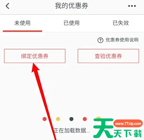 进入应用,点击【优惠券】 在优惠券界面点击【绑定优惠券】 输入券号与密码后点击‘绑定新优惠券’ @天天下载TTzip 除特别注明外,本站所有文章均为 天天下载 原创,转载请注明出处来自 https://www.ttzip.com/198003.html
