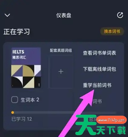 进入不背单词首页,点击右下角的方形图标。 进入下一页,点击正在学习右侧三个点图标。 在弹出的页面中点击重学当前词书。 弹出一个提示框,点击重学即可。 @天天下载TTzip 除特别注明外,本站所有文章均为 天天下载 原创,转载请注明出处来自 https://www.ttzip.com/198022.html