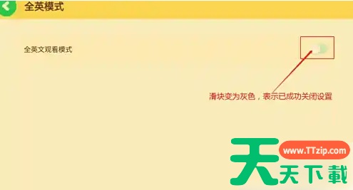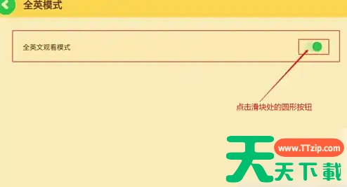 打开“全英模式”设置界面,点击“全英文观看模式”后方滑块处的圆形按钮;
