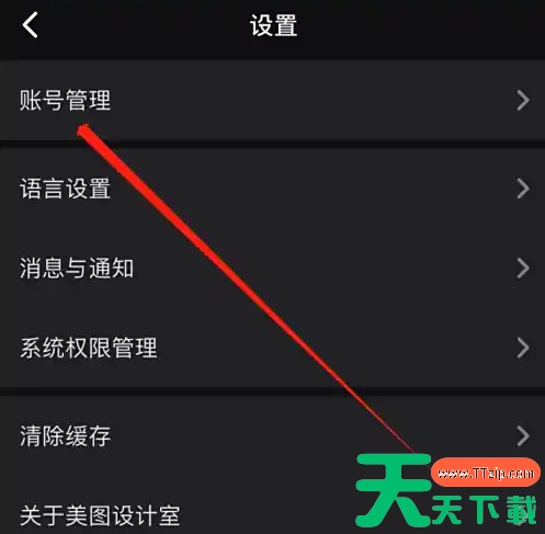打开美图设计室app后,在我的界面点击设置。 点击账号管理。 在此界面点击切换账号,即可切换登录账号了。 @天天下载TTzip 除特别注明外,本站所有文章均为 天天下载 原创,转载请注明出处来自 https://www.ttzip.com/198036.html