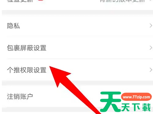 点击设置选项 打开我的页面,点击设置选项。 点击个推权限设置选项 进入页面,点击个推权限设置选项。 打开天猫/淘宝的选项开关 找到取件行为数据同步设置选项,打开天猫/淘宝的选项开关即可。 @天天下载TTzip 除特别注明外,本站所有文章均为 天天下载 原创,转载请注明出处来自 https://www.ttzip.com/198103.html