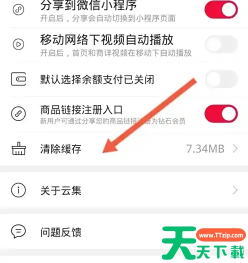 首先进入手机的云集软件,点击下面的我的。 点击下面的设置图标。 点击上面的清除缓存。 最后就成功清除了缓存、如下图所示。 @天天下载TTzip 除特别注明外,本站所有文章均为 天天下载 原创,转载请注明出处来自 https://www.ttzip.com/198107.html