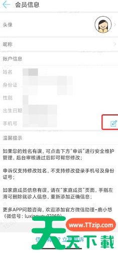 1、用户在我的页面中点击头像按钮; 2、在会员信息页面中点击手机号右侧的编辑按钮; 3、输入新手机号,点击确认修改按钮就修改成功了。 @天天下载TTzip 除特别注明外,本站所有文章均为 天天下载 原创,转载请注明出处来自 https://www.ttzip.com/198117.html