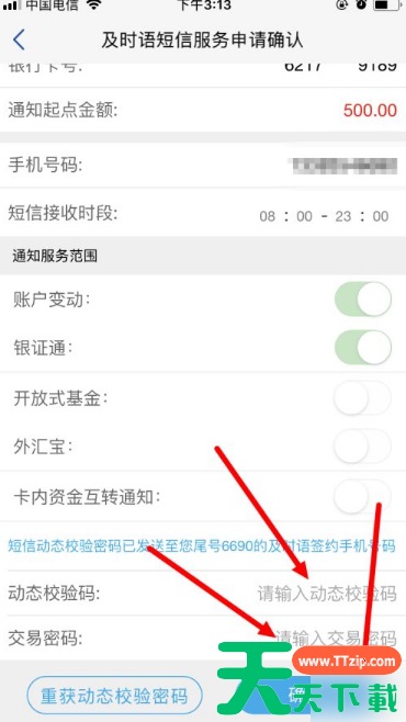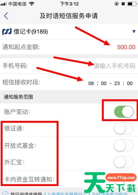 输入 通知起点金额 、 手机号码、短信接收时段 以及 通知服务范围 。