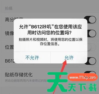 打开手机B612咔叽相机,在首页的左上角有个小圆圈,如下图 我们点击打开这个小圆圈,就可以看到B612咔叽相机的设置 点击设置,进入到B612咔叽相机的设置页面,在这里可以看到位置信息设置项 点击开启这个位置信息,系统会提示你开启手机的 位置共享功能,如下图 手机位置共享打开之后,再次打开B612咔叽相机,点击允许B612咔叽相机访问您的位置 允许确定之后,那么你的B612咔叽相机位置信息就已经开启成功啦,这样你拍照发给小伙伴的时候就可以共享位置啦 @天天下载TTzip 除特别注明外,本站所有文章均为 天天下载 原创,转载请注明出处来自 https://www.ttzip.com/198304.html