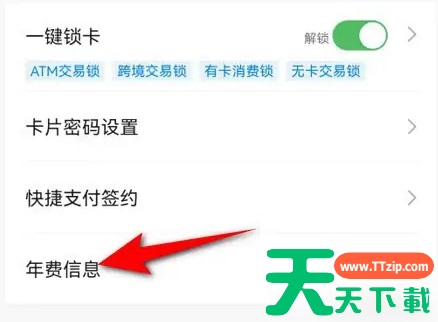 打开金融页面,点击卡片管理,如下图所示。 接着点击信用卡后面的详情,如下图所示。 下拉页面,点击年费信息,如下图所示。 页面跳转,就可以查看年费金额了,如下图所示。 @天天资源网TTzip 除特别注明外,本站所有文章均为 天天下载 原创,转载请注明出处来自 https://www.ttzip.com/198627.html