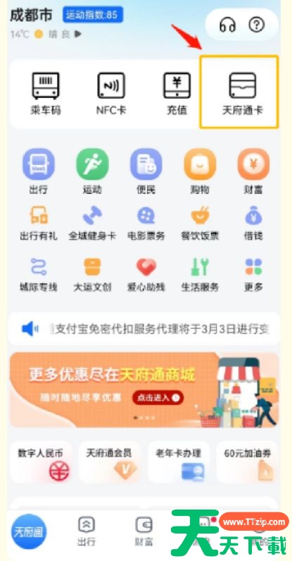1.手机具备NFC功能,且已打开;确保手机网络信号通畅,下载并实名注册天府通APP,登录天府通APP,点击首页“天府通卡