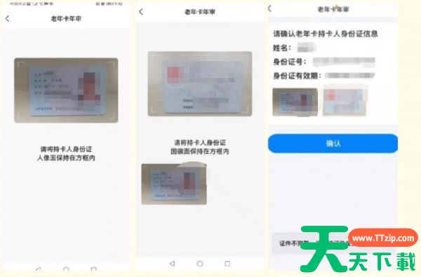 6.根据提示将老年卡持卡人身份证人像面和国徽面保持在方框内,对页面显示的姓名、身份证号、身份证有效期进行确认。