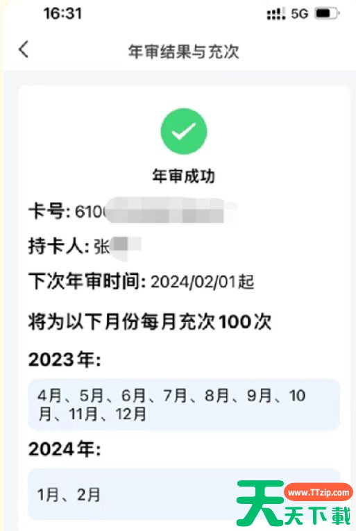 10.充次成功后,页面会展示卡片续充的月份、剩余次数,您可上下滑动查看所有充次月份。