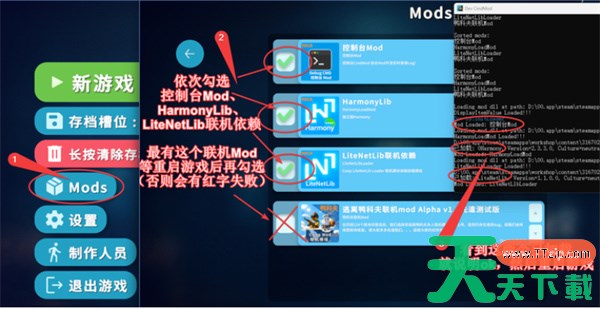 打开游戏,点击Mod 依图勾选前三个Mod后 重启游戏