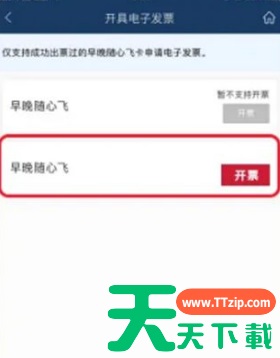 4、进入东航APP“我的—我的订单”,选择已购买的随心飞产品,然后点击电子发票,选择可开票的随心飞产品,提交开票信息后即可成功开票。