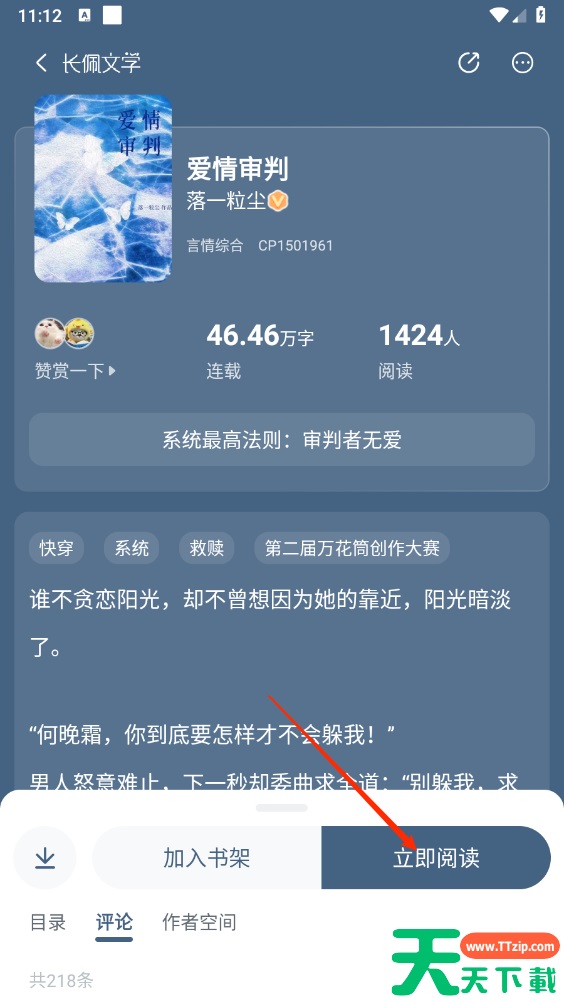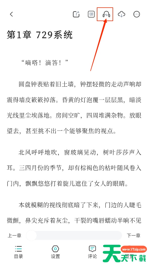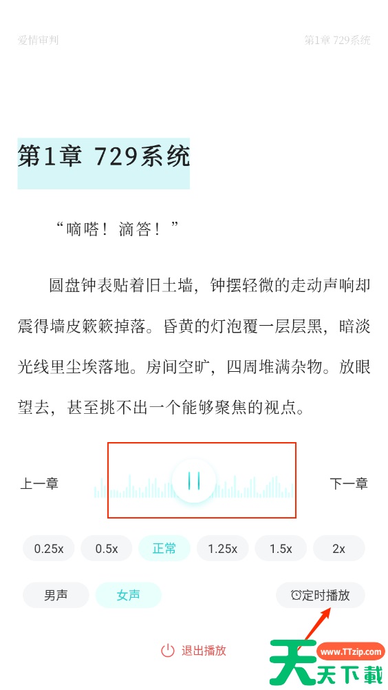 1、在本站下载安装后进入软件,选择需要听书的小说进入。 2、在小说详情页点击"立即阅读"。 3、进入阅读页面点击中间区域呼出菜单,然后点击"听书"图标,如图。 4、如图所示,即可开启听书体验了,还可以进行设置定时听书、播放速度等。 @天天资源网TTzip 除特别注明外,本站所有文章均为 天天下载 原创,转载请注明出处来自 https://www.ttzip.com/199091.html