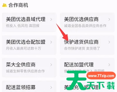 解锁我们的手机屏幕,打开美团,点击“我的”图标。 在我的账户页面,点击“合作/招聘”。 然后,点击“快驴进货供应商”选项。 最后,在该页面中有加盟方法,按照页面中的方法联系客服加盟即可。 @天天资源网TTzip 除特别注明外,本站所有文章均为 天天下载 原创,转载请注明出处来自 https://www.ttzip.com/199958.html