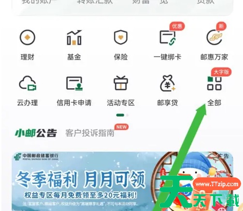 首先,进入邮储银行软件页面,点击首页进入; 然后,进入首页页面,点击全部; 最后,进入全部功能页面,点击扫一扫即可。 @天天资源网TTzip 除特别注明外,本站所有文章均为 天天下载 原创,转载请注明出处来自 https://www.ttzip.com/199974.html