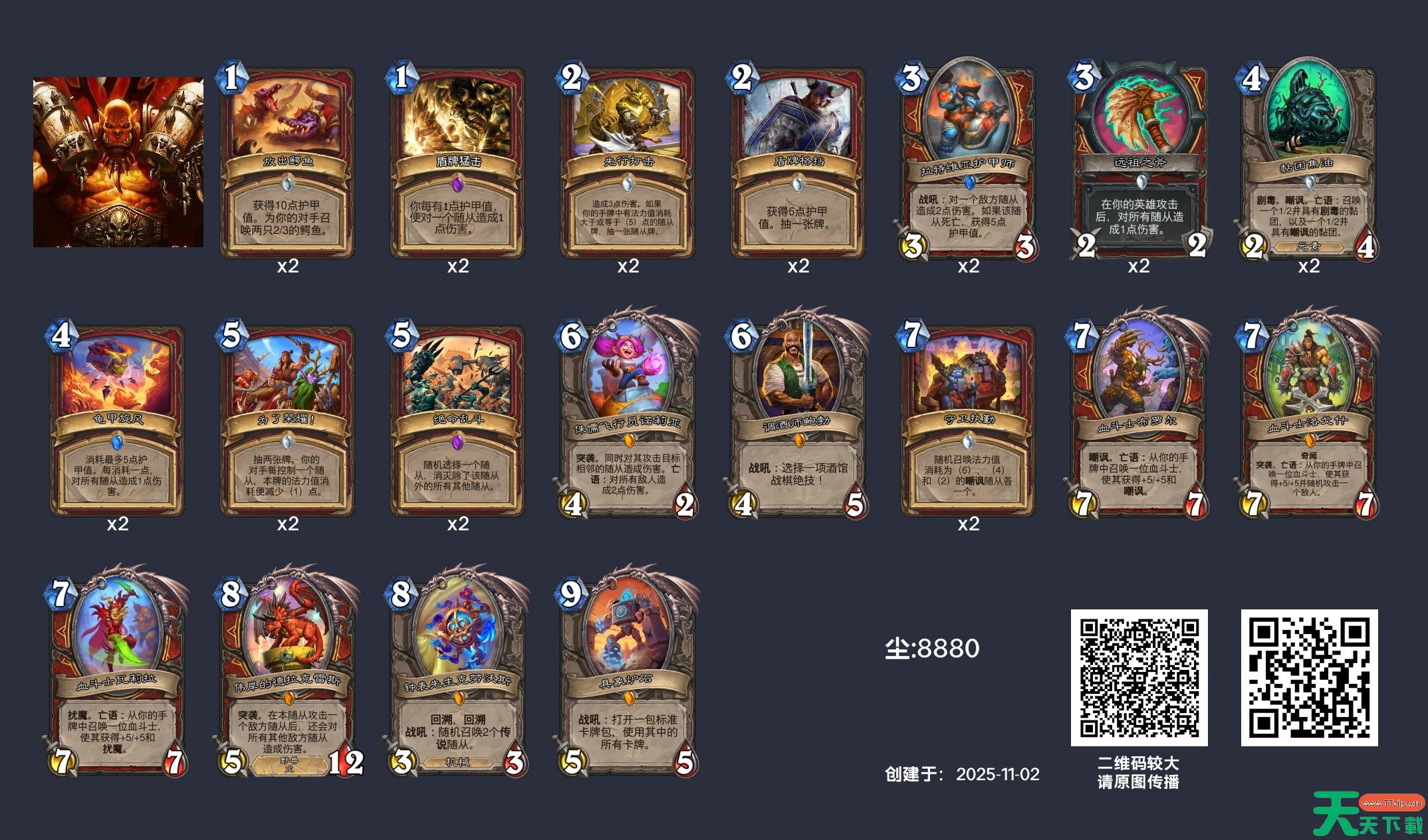 炉石传说穿越时间流版本即将上线,而在抢先体验服已经有不少的玩家用新卡组上分了,那么炉石传说穿越时间流有什么强力的上分卡组呢?相信大家都想了解,下面为大家带来的炉石传说洛戈什战卡组内容,感兴趣的玩家们千万不要错过哦! 炉石传说洛戈什战卡组11月 洛戈什战 2008场66.3胜率 AAEBAQcIo6IG4esG25cHhJ0Hm6UHnaUHnqUHxq4HC4igBImgBI7UBNOXB4uYB4ecB8qfB9WmB+qnB/yvB4+xBwAA 以上就是关于炉石传说洛戈什战卡组怎么样的全部内容了,希望能为各位玩家们带来帮助,想要了解更多游戏攻略及资讯请持续关注天天下载(ttzip.com)。 @天天软件站Ttzip 除特别注明外,本站所有文章均为 天天下载 原创,转载请注明出处来自 https://www.ttzip.com/200121.html