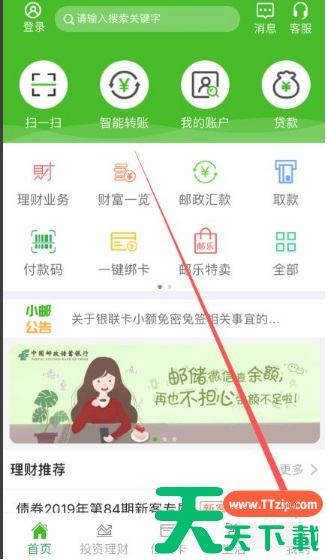 首先我们需要打开邮政银行app,如下图所示。点击页面中的我的入口。