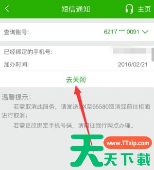 进入短信通知页面后,如下图所示,找到你的相关银行卡,点击页面下方的关闭服务入口。如红标所示