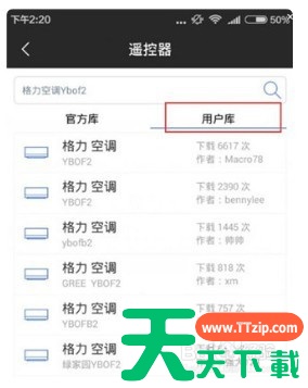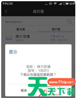 进入遥控精灵界面后,选择添加控制,就可以看见如下图所示。然后在搜索栏里搜索家里自带红外线设备的电器名字 然后会出现一个官方库,这里就是从官方数据库里导入的遥控器数据 而用户库则是其他用户添加的数据 可以自由的从官方库或者用户库里选择一个与自家设备相符合的数据来添加,点击确定即可添加成功 @天天资源网TTzip 除特别注明外,本站所有文章均为 天天下载 原创,转载请注明出处来自 https://www.ttzip.com/200594.html