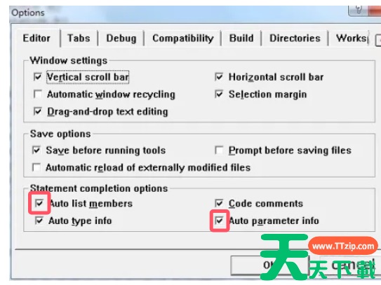 (这里就能看见 3 个复选框:Auto list members / Auto parameter info / Code tool tips,把前两项勾上 → OK)