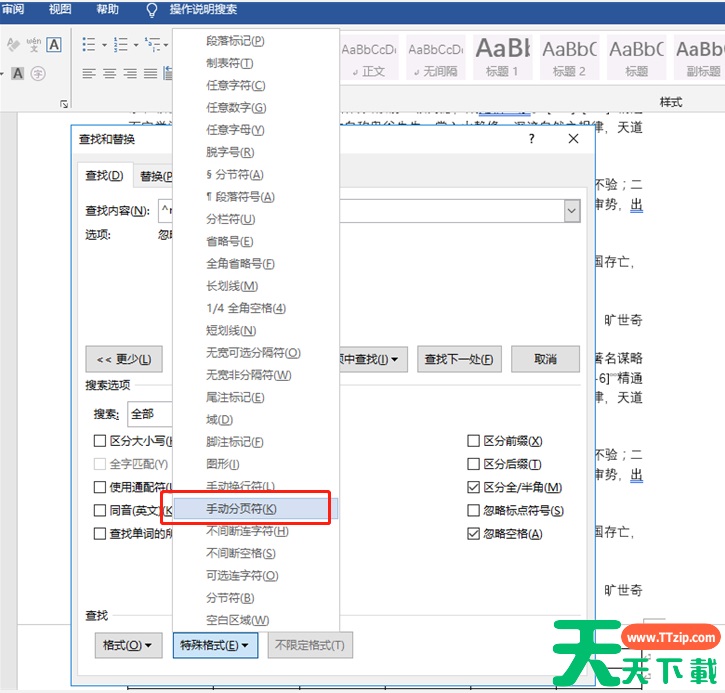 可以利用查找替换来删除文档中有多个空白页。使用Word快捷键「Ctrl+H」打开查找替换窗口,然后单击「高级」或「更多」,在「特殊格式」中选择「手动分页符」。