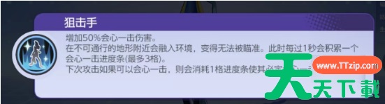 想要玩好千面避役,我们需要先了解它的招式,它的普攻第三次是强化普攻,命中的时候会造成伤害并且有20%会心一击的概率,它的特性是狙击手会增加自身50%会心一击的概率,并且在无法通行的地形附近可以自然的融入到环境中,无法被敌人瞄准,在该状态下每过一秒就会积累一个会心一击的进度条,最多能积攒到三格,下一次普攻或有可能造成会心一击的技能释放时,会消耗一格进度条并变为必定会心一击;
