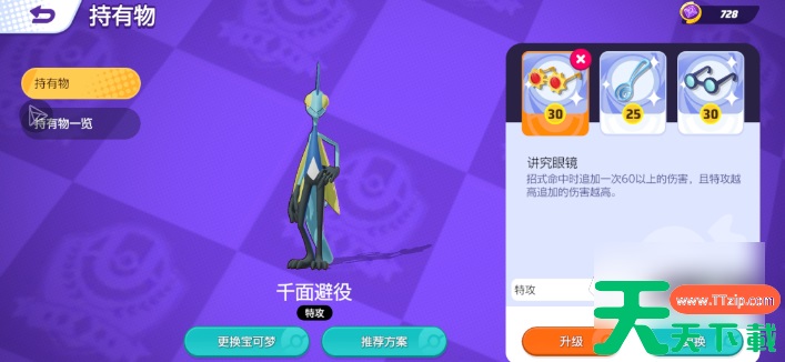 持有物建议大家选讲究眼镜或穿透汤匙,讲究眼镜能在招式命中的时候追加一次60以上的伤害,很适合千面避役这样特攻高的宝可梦,穿透汤匙则是能增加技能穿透率。