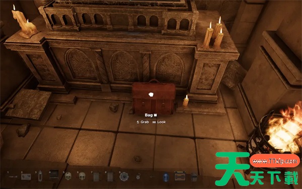 左边是一张桌子,上面有一个骑士的小雕像。搜索桌子底部的袋子,然后将木桩带进去。