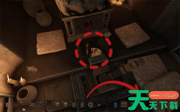 拉动雕像底部出现的杠杆,拿起骷髅头和木桩。