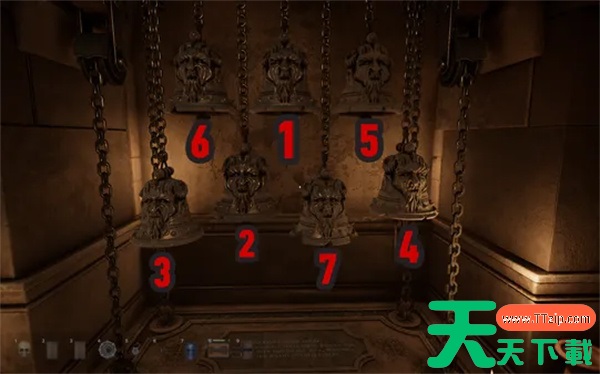 阅读铃下地板上的牌匾。敲响一个铃时,它们的“祖先”也会跟着响。尝试每个铃以确定顺序,并按从长到幼的顺序敲响铃。