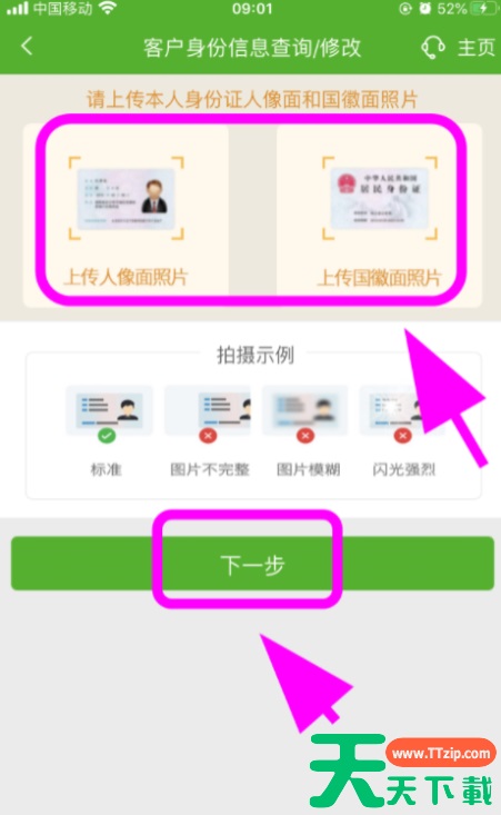 6、跳转身份信息页面,拍摄上传【现有身份证信息】,点击【下一步】,审核通过,完成。