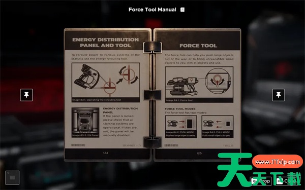墙上附近有一本工具手册,教你如何使用它。房间周围有几个上锁的区域,标有红色锁和一个数字。数字表示开启锁所需的能量值。