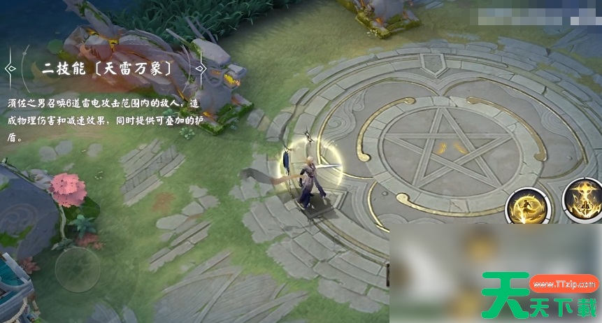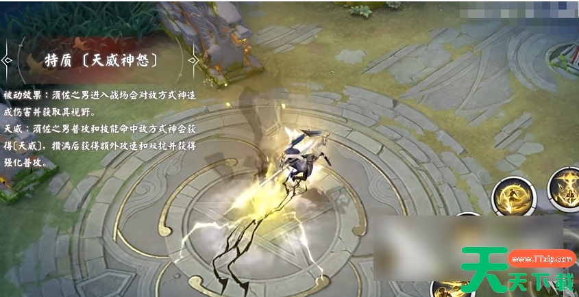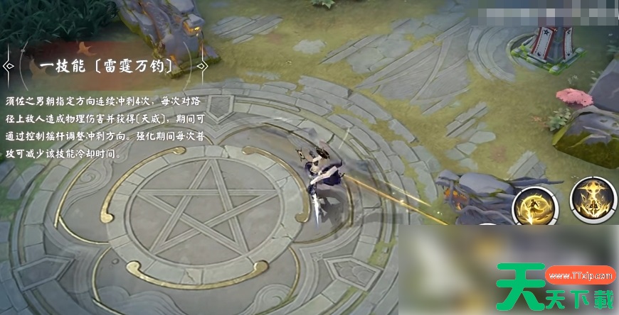 一技能“雷霆万钧”也是非常厉害的主动伤害技,使用之后会朝着指定的方向进行连续四次冲刺,冲刺过程中碰到敌人会对其造成伤害并积攒一层“天威”,同时期间还能通过控制摇杆来调整冲刺方向,并且冲刺的过程中还能衔接普攻,不仅能造成额外一次平A伤害,更可以减少技能本身的冷却时间。