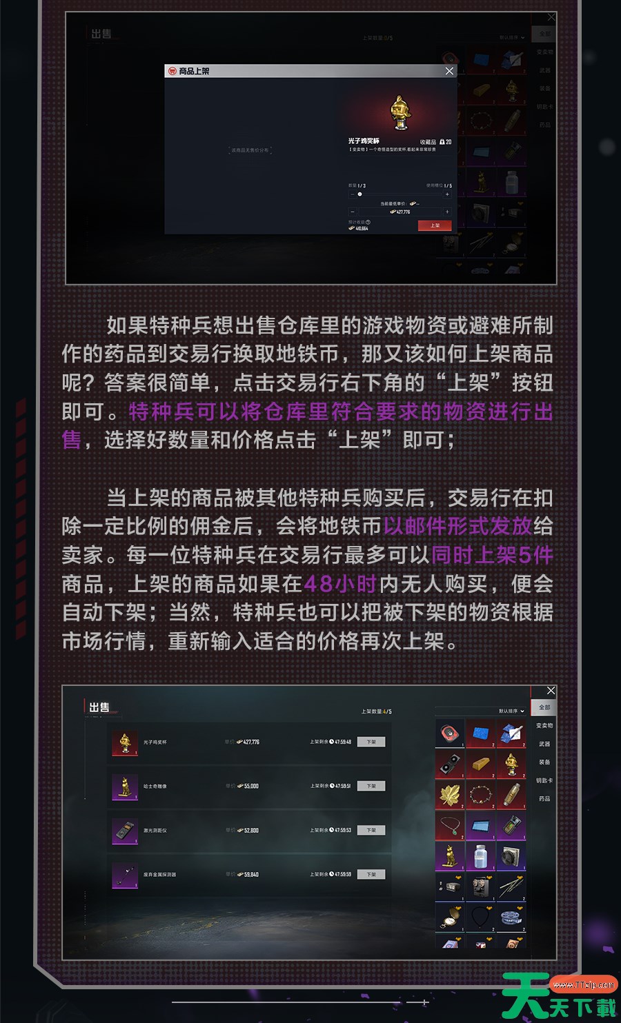 在全新的交易行系统中,特种兵们可以将自己仓库内的变卖物和枪械等物资上架出售,也可以根据自己的需要来购买其他玩家上架的物资。