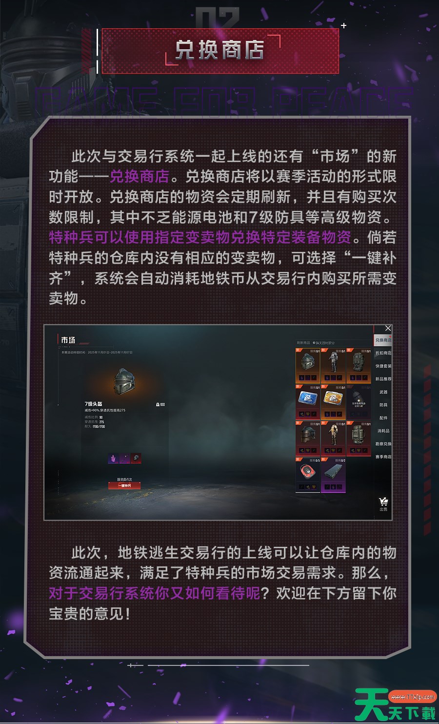 和平精英在即将到来的冬季版本中将上线地铁逃生交易行,这个地铁逃生交易行究竟是什么呢?大家都想了解吧,那么下面就快跟随天天下载Ttzip一起来了解一下和平精英地铁逃生交易行吧。