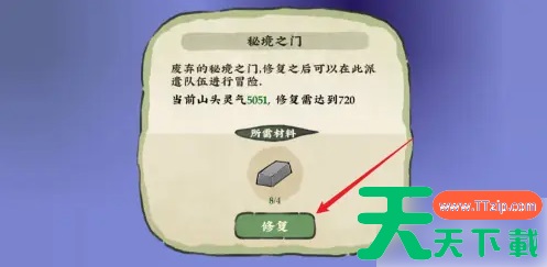 在游戏界面,找到破烂的秘境之门 弹出窗口,放入铁锭,点击修复 修复完成,即可开启秘境之门 @天天资源网TTzip 除特别注明外,本站所有文章均为 天天下载 原创,转载请注明出处来自 https://www.ttzip.com/201152.html