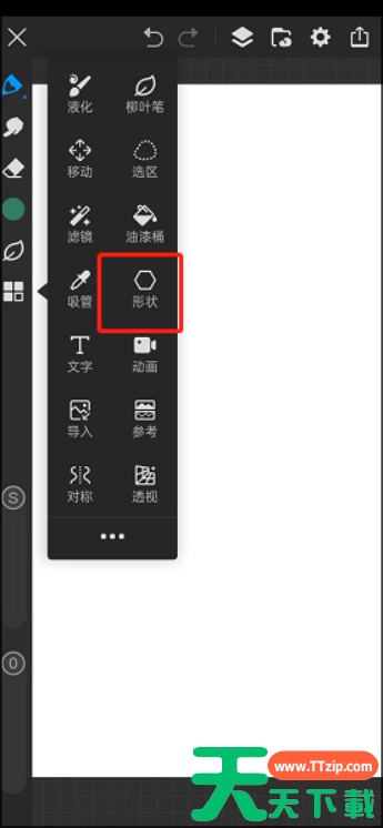 2、进入到软件绘画的界面,点击左侧菜单栏中的的小菜单,接着找到并点击“形状”工具。