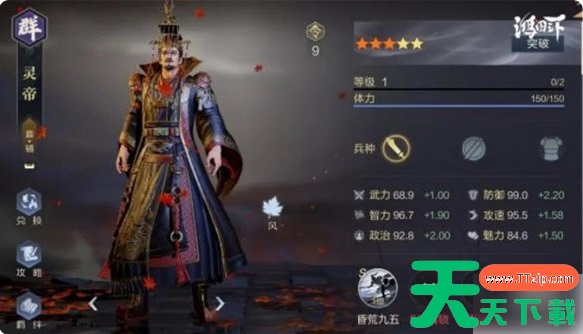 优点一:灵帝的指挥技能昏荒九五,能够提升平民四星武将属性值不足的缺点,大大的拉近了和五星武将的属性成长差距。