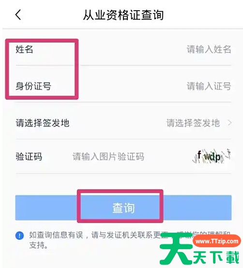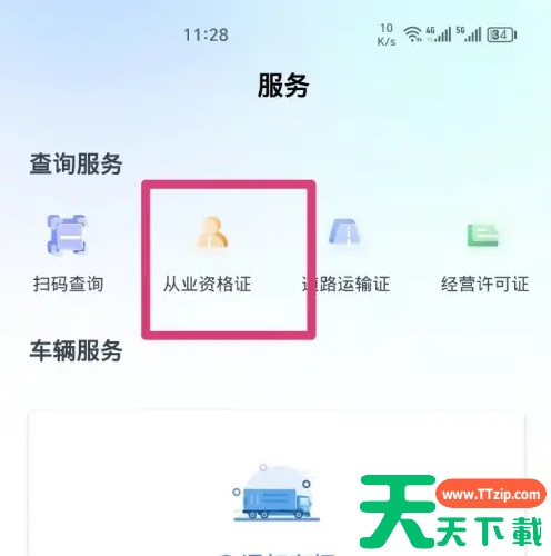 第一步:打开运证通APP,点击页面上的【服务】 第二步:在服务页面,点击【从业资格证】 第三步:输入姓名和身份证号,点击【查询】即可 @天天资源网TTzip 除特别注明外,本站所有文章均为 天天下载 原创,转载请注明出处来自 https://www.ttzip.com/201393.html