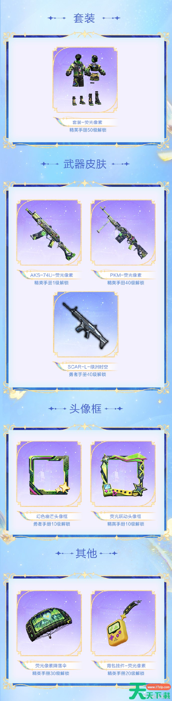 绿洲启元新赛季手册【荧光像素】火热上线!升级即可免费领取枪皮、头像框等丰富奖励,满级返还绿洲币,无限续杯!