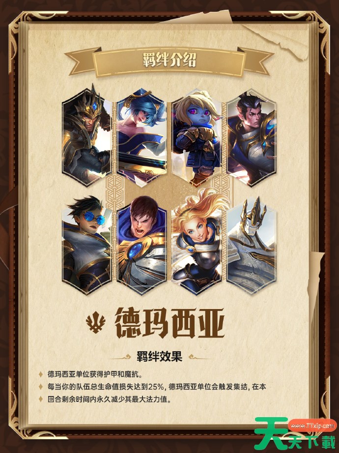 金铲铲之战即将迎来全新赛季,这个赛季将会上线全新的棋子、羁绊等内容,那么大家知道德玛西亚羁绊怎么样呢?下卖弄就快跟随天天下载TTzip一起来看看金铲铲之战德玛西亚羁绊吧。