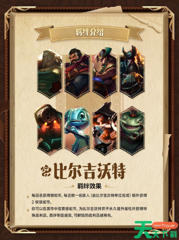 金铲铲之战即将迎来全新赛季,这个赛季将会上线全新的棋子、羁绊等内容,那么大家知道比尔吉沃特羁绊怎么样呢?下卖弄就快跟随天天下载TTzip一起来看看金铲铲之战比尔吉沃特羁绊吧。