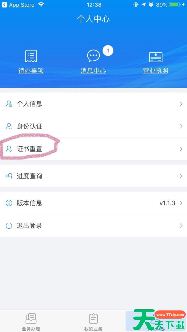 登录后,点击右下角个人中心,先自行设置一个证书密码