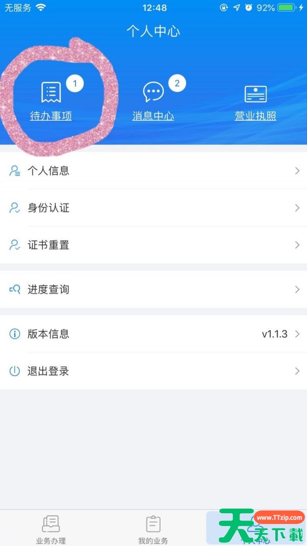 证书密码设置后回到个人中心界面,点左上角待办事项