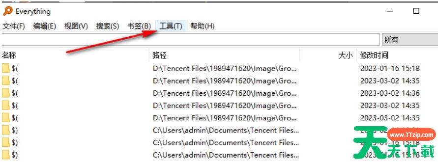 开启电脑中的Everything软件,在软件工具栏里找到“工具”选项,点击打开。